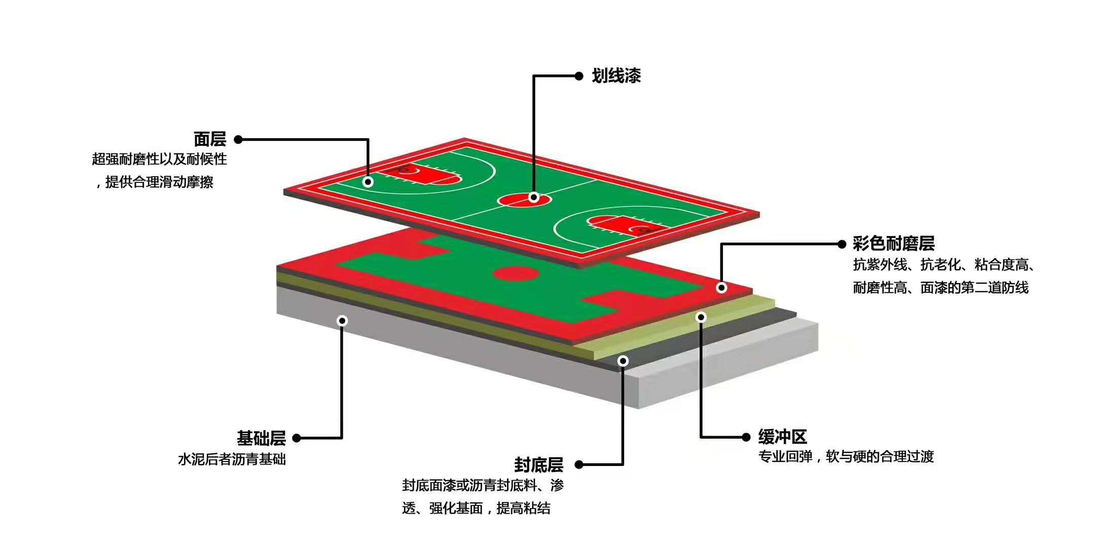 1.防水層:地面需已做好防水處理(防水層),室外球場必須做5cm以上的瀝青防水;